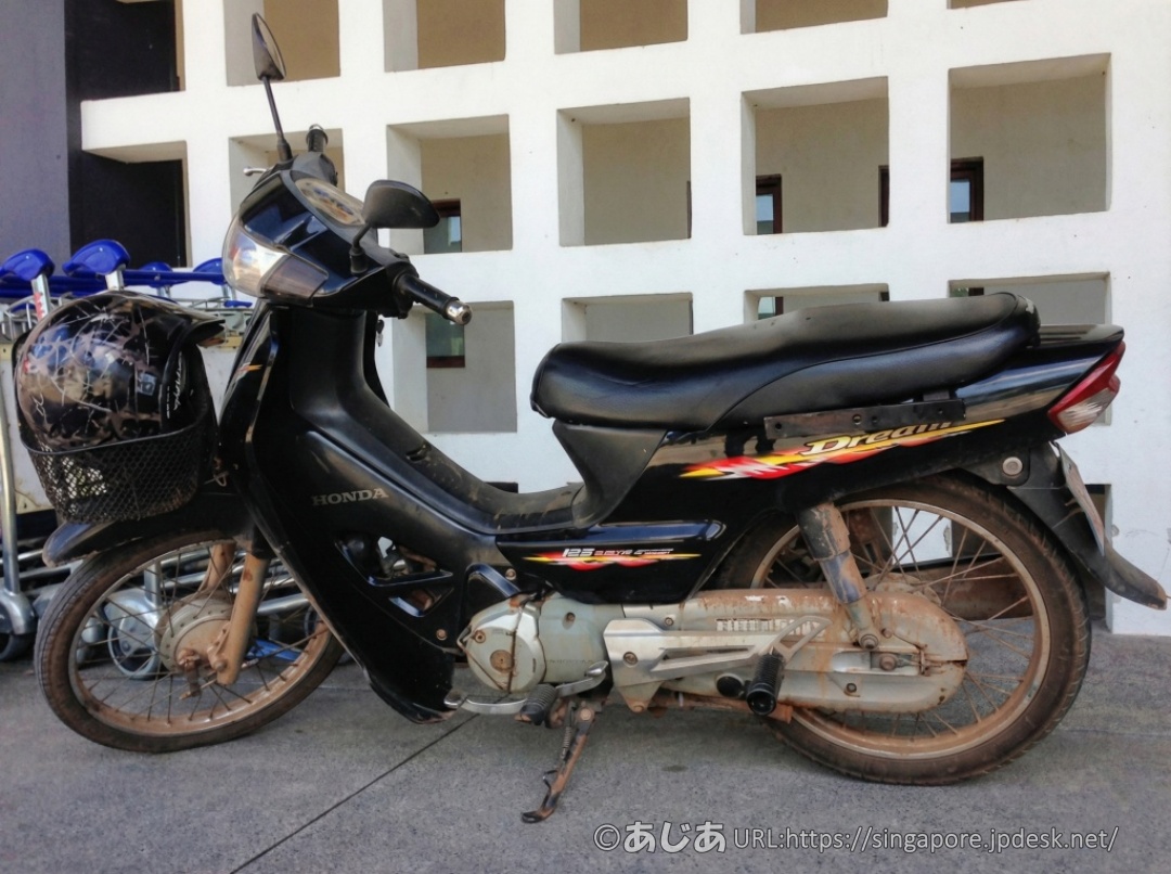こちらが今回お世話になったトゥクトゥクのバイク部分です。ドライバーのお兄さん、ベンメリア遺跡に行く時に座席部分を取り外してきました。ベンメリア遺跡までは40キロくらい距離があって、整備されていないところも通るので、座席部分が邪魔だったんだと思います。