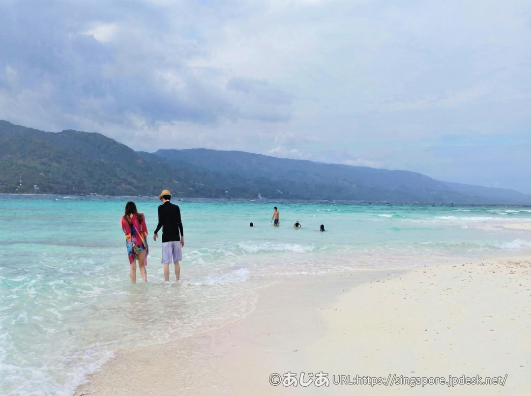 オスロブからスミロン島へ船で15分ほど。道中スミロン島手前の海で船を停め、透明度抜群の海でシュノーケリング、海岸から上陸して少し歩けばホワイトサンドのビーチ。