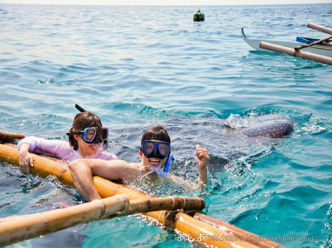 こんな感じの簡易ボートに乗って沖へでると、ボートのすぐ横をジンベイザメがどんどん通りすぎていきます。