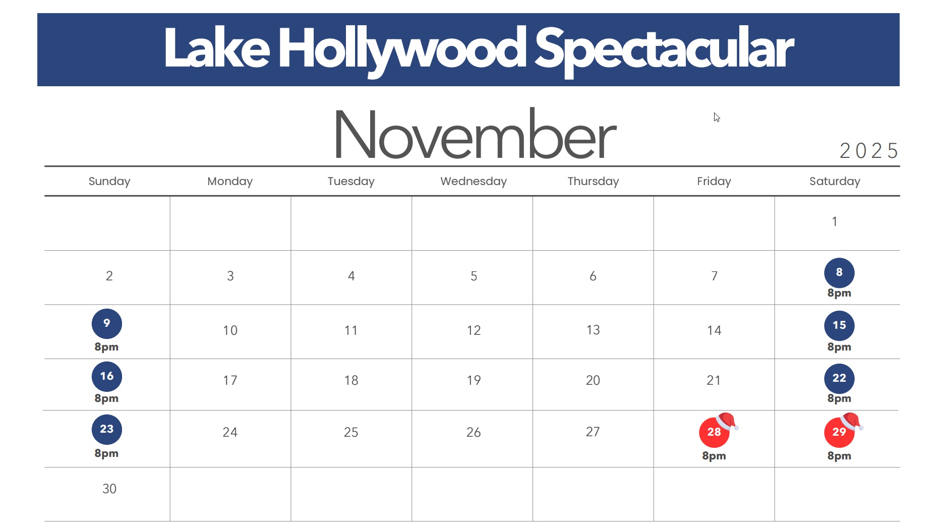 そして、2025年11月28日(金)からは花火ショ―はクリスマスバージョン「レイク ハリウッド クリスマス ファイヤーワークス(Lake Hollywood Christmas Fireworks)」が始まります。