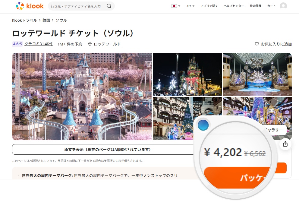 こちらがKlookのサイト。定価6,562円(本記事執筆時点)のチケットを4,202円で買うことができます。この時点で36%割引!です。