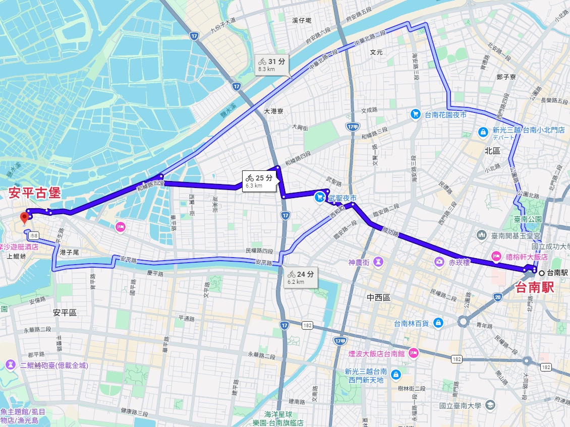 安平エリアは、台南市の中心部(台南駅周辺)から西へ5~6キロほど離れた海沿いに位置しています。