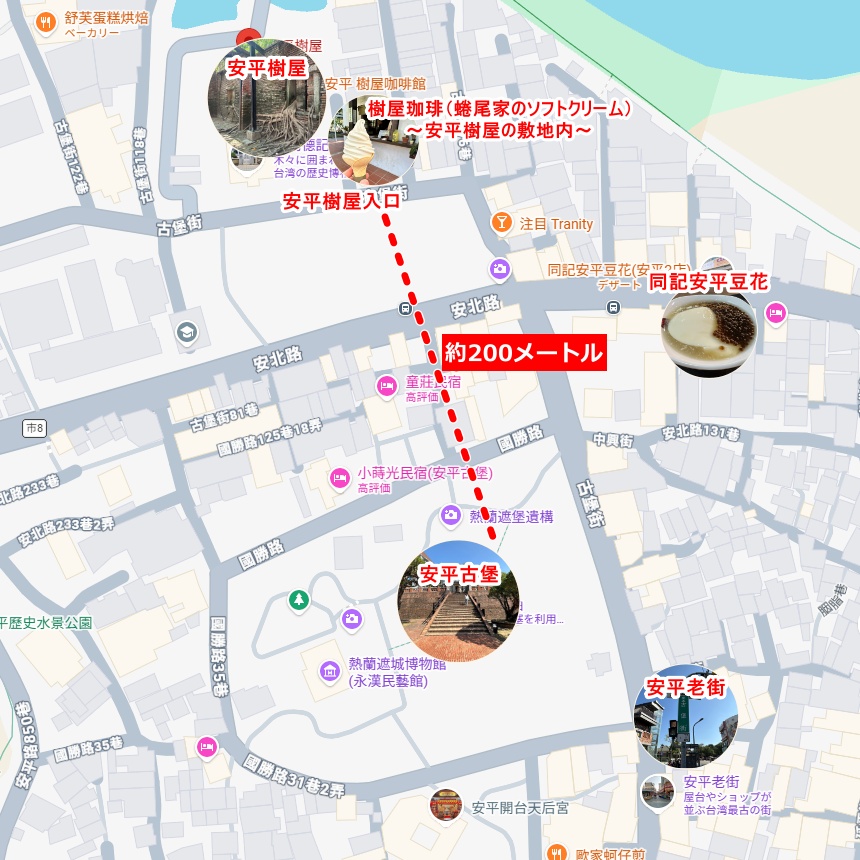 「蜷尾家のソフトクリーム」はガジュマルの家「安平樹屋」の敷地内、「同記安平豆花」は安平古堡と安平樹屋の間を通る安北路沿いにあります。