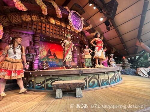 モアナは、アドベンチャーランドの専用ステージで行われる、コメディータッチのミュージカルショーです。ショーは、モアナは英語、その他のキャラクターは広東語で進めらます。広東語が分からなくても英語がわかれば想像で楽しめますが、モアナの映画を見たことがないとキツいと思います。