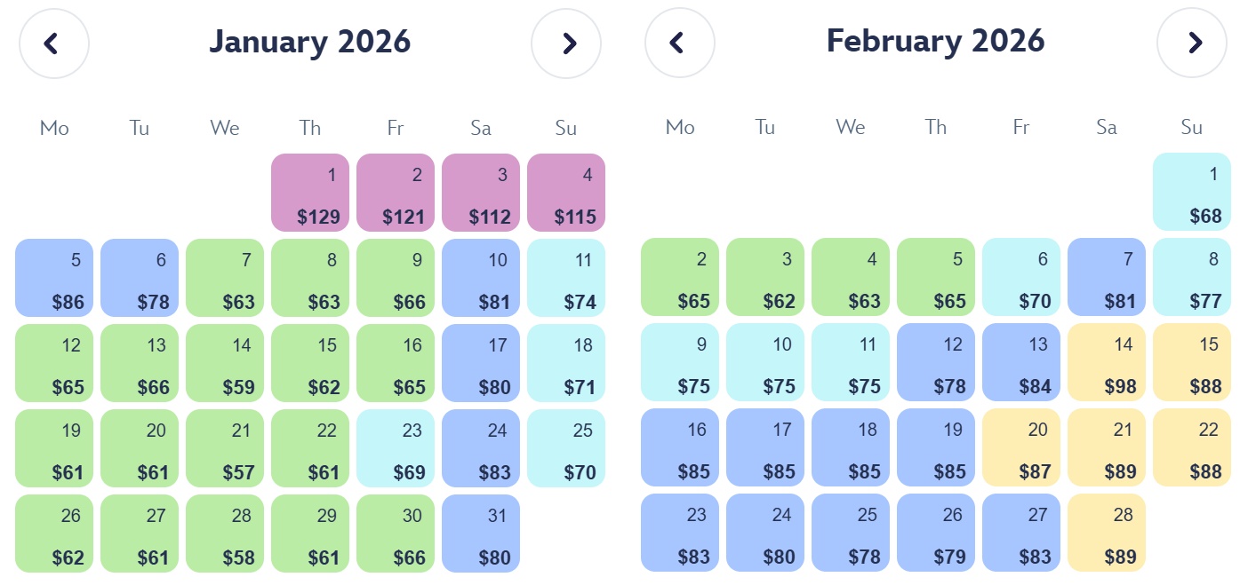 料金設定は6段階。6段階なんですが、その1段階の中でも幅があるので、ある意味日替わりで料金が変わる!くらいの感じになっています(カレンダーの色分けが料金段階ですが、同じ色でも料金が異なっているのがおわかりいただけると思います)。