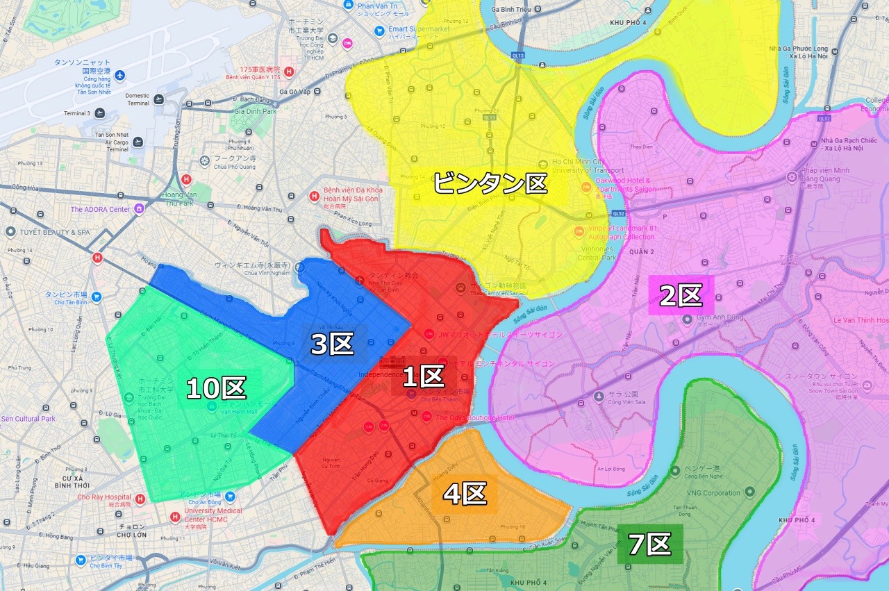 1区の北側に隣接し、中心地と空港をつなぐ中間エリア。古い住宅街と新興エリアが混在しています。ベトナム一高いビル「ランドマーク81」が完成し、観光客にも人気のエリアとなっています。