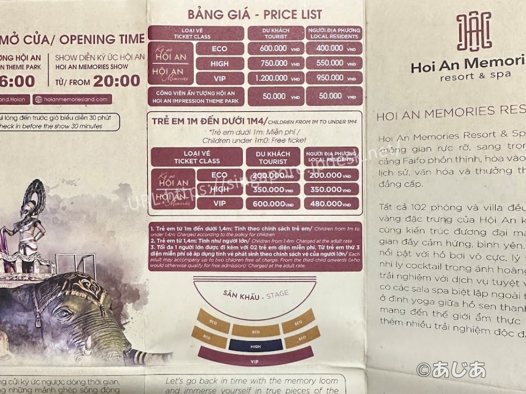 この記事の初めのFAQ(よくある質問)で記載した通り、ホイアンメモリーズショーのチケットは、VIP、HI、ECOの3種類がある、それぞれの料金は、VIPが1,200,000ドン、HIが750,000ドン、ECOが600,000ドンとなっています。