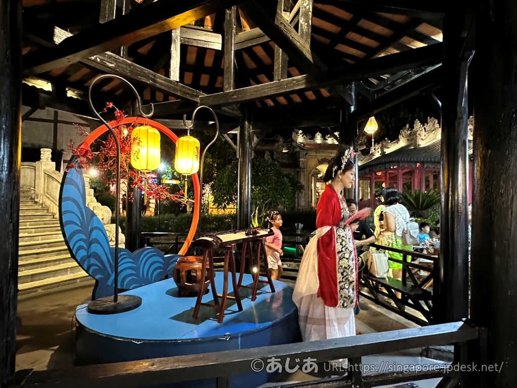 祠や寺院を模した静かなエリア。交易都市として多文化の信仰が交わったホイアンの精神的な側面を感じ取れるエリアです。ベトナムの民族衣装をまとった女性キャストが撮影に応じてくれます。