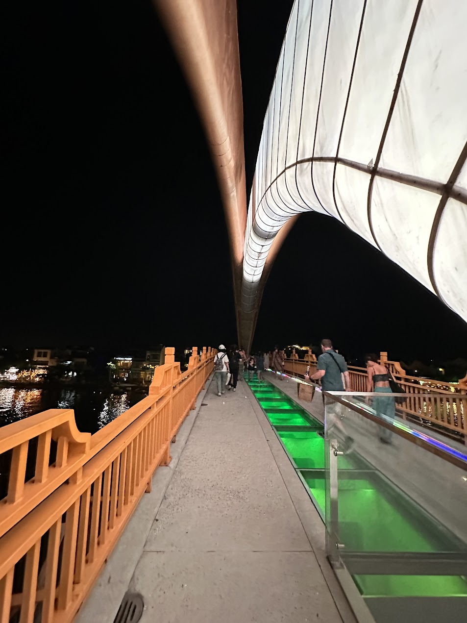 陽が落ちるとムーンブリッジはライトアップされます。橋の一部はシースルーのガラス製。キラキラにデコレーションされたランタンボートが眼下を通り過ぎる不思議な光景を見ることができます。