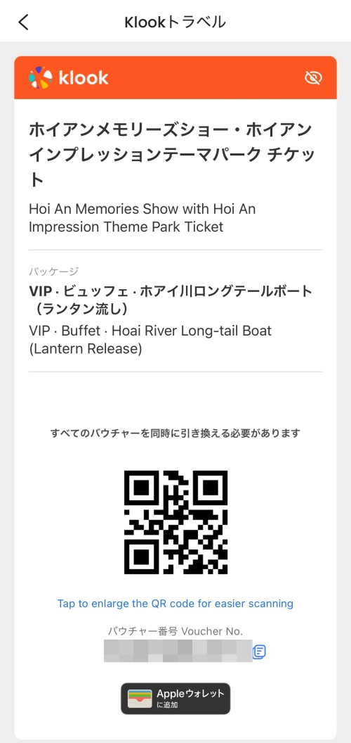 Klookで予約するとこんな感じのQRコードがメールで送られてきます。これをスマホに表示して集合場所で提示すればOK。簡単です。