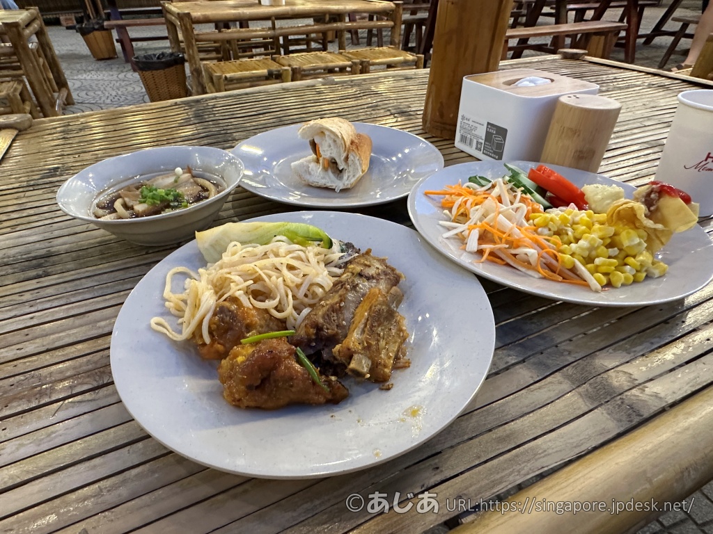 中はこんな感じです。オープンスペースにベトナムレトロな椅子とローテーブル。その周りにビュッフェメニューが並ぶという感じです。