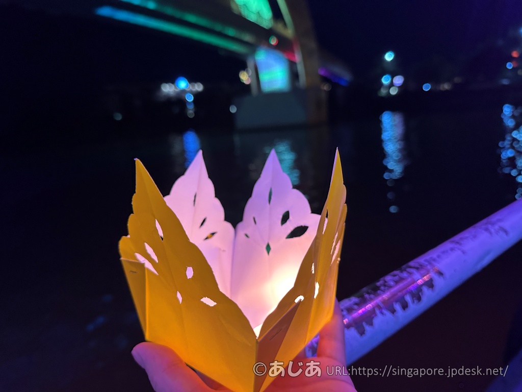 送迎ボートのもう一つの特典がこの灯籠流し体験です。ショーを見終わった後、帰りの船の出航直後にムーンブリッジ周辺で行います。