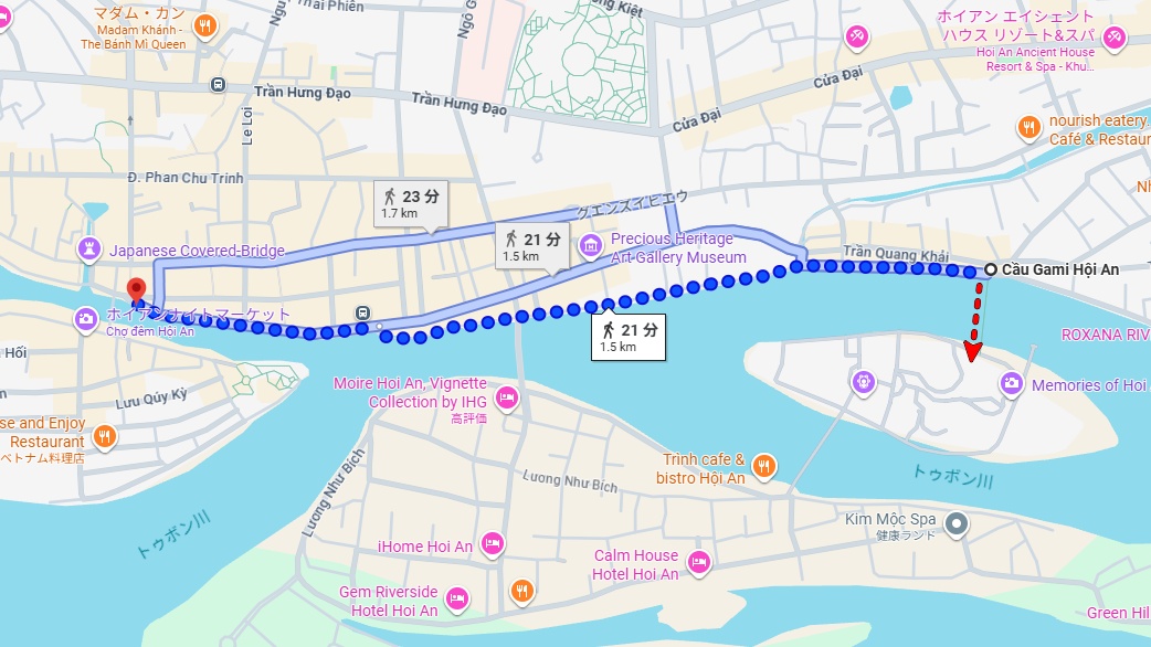 ホイアン観光の中心地、ナイトマーケットやオールドマーケットから、メモリーズショーが公演されているホイアンメモリーズランドまでは約1.5km。徒歩で行けます。Grabでも行けます。ホイアン市場付近から乗れるランタン流し体験付きの送迎ボートも人気です。