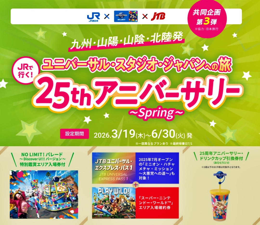 九州・山陽・山陰・北陸在住の方、朗報です。JR西日本とユニバとJTBのコラボ企画の第3弾。