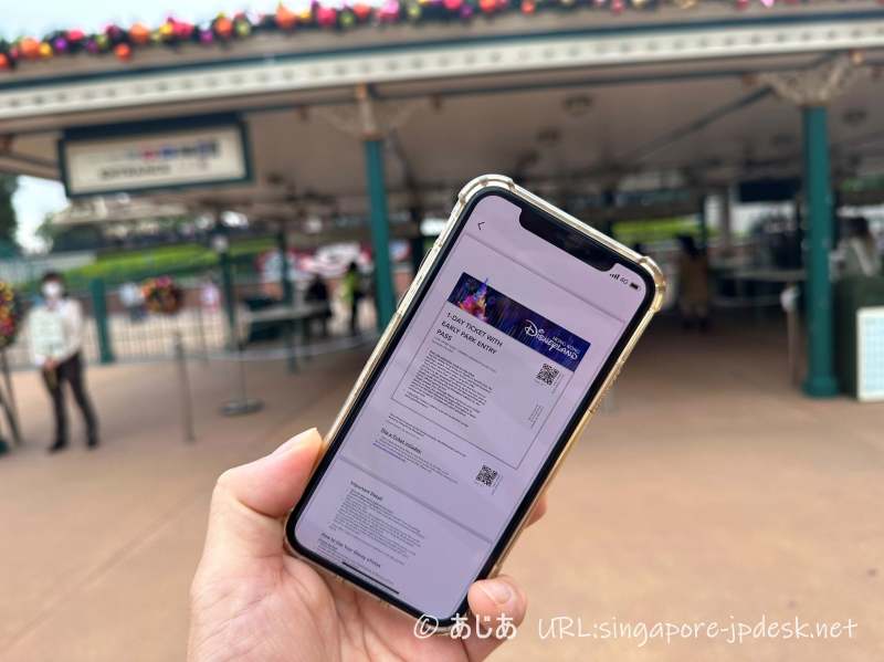 メールで届いたチケット(QRコード)をスマホ画面に表示して、それ(QRコード)をゲートにタッチして入場するか、ゲートの係員に見せて入場する場合がほとんどです。稀に、QRコードをチケット売場に見せて紙のチケットを受けとってから入場することもあります。