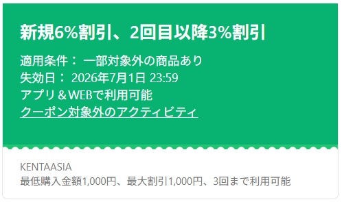 クーポンコードは、私「KENTA」と当サイト「ASIA」を組み合わせた「KENTAASIA」。当サイト限定!渾身の割引クーポン。当サイトだけの限定クーポン(第1弾)です。