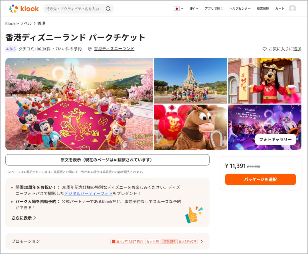 Klookでは香港ディズニーランドの割引強化中!