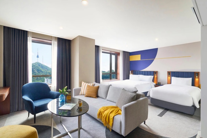 館内にはレストラン、フィットネスセンター、屋内プールなどがあり、観光だけでなくホテル時間も楽しみたい人にぴったり。クラブラウンジからはNソウルタワー方面の眺めも楽しめ、明洞ステイに少し上質感を足したい時におすすめです。カップル旅行や母娘旅にも使いやすい印象です。