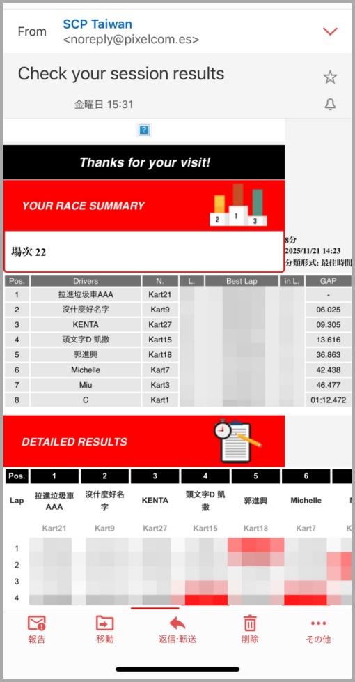 注意点があるとしたら1点だけ。メールアドレスは正確なものにしましょう。レース後にこのアドレスにレース結果が届きます。こんな感じのメールです。