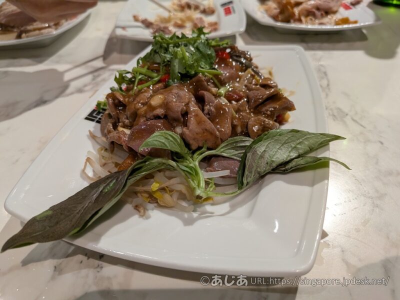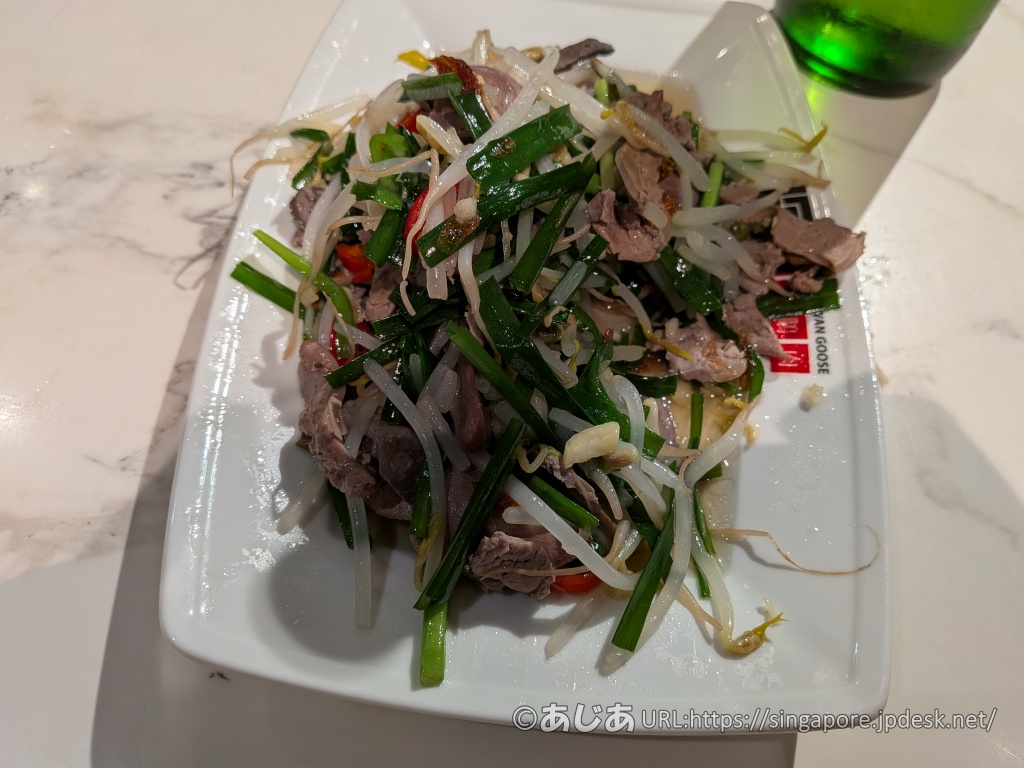 韭菜下水。レバニラ炒めっぽい感じです。このお店、レバーの臭み抜きが得意じゃないのか、それともガチョウの特徴なのか、すこーしエグみが残っていて今いちです。