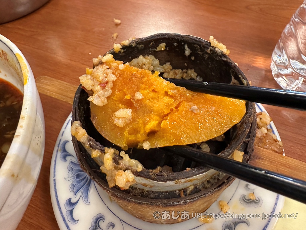 さらに食べ進むと、底の方に大きなサツマイモ?が2つ埋まっています。かぼちゃ?さつまいも?よくわからない代物ですが、中身のほとんどがこれです(笑)。
