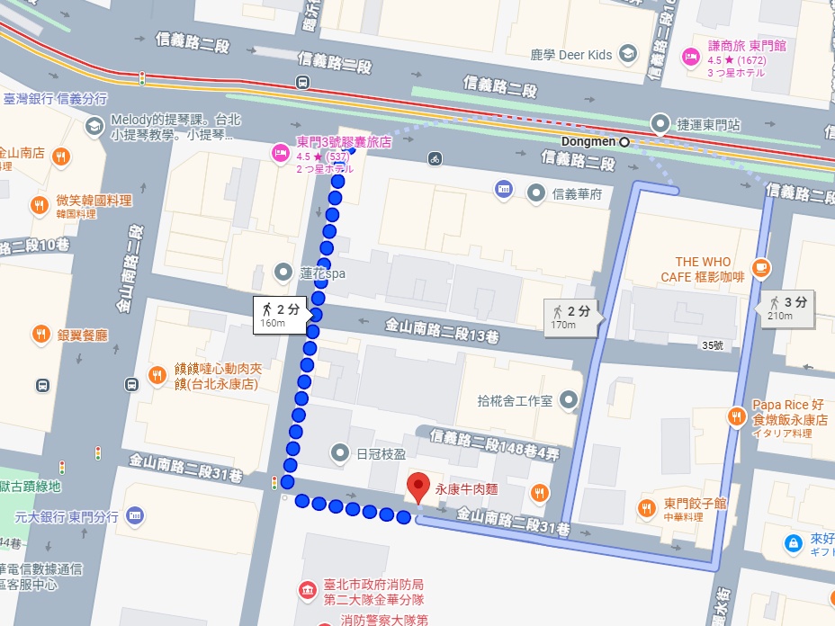 MRT東門駅の5番出口から永康街(ヨンカンチエ)を経由して行っても、歩いて4~5分です。