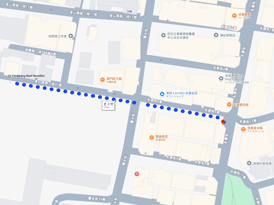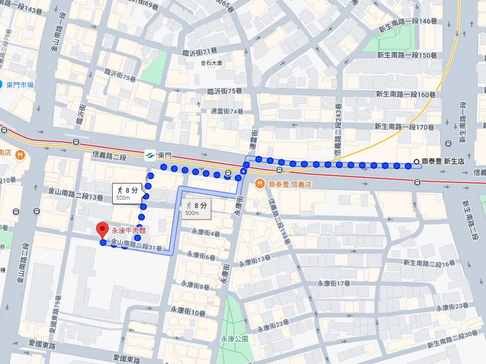 もしお腹に余裕があったら、同じエリアにある小籠包の有名店・鼎泰豊(新生店)も行けちゃいます。鼎泰豊新生店から永康牛肉麵までは、グーグルマップだと徒歩7分。腹ごなしにちょうどいい距離感です。