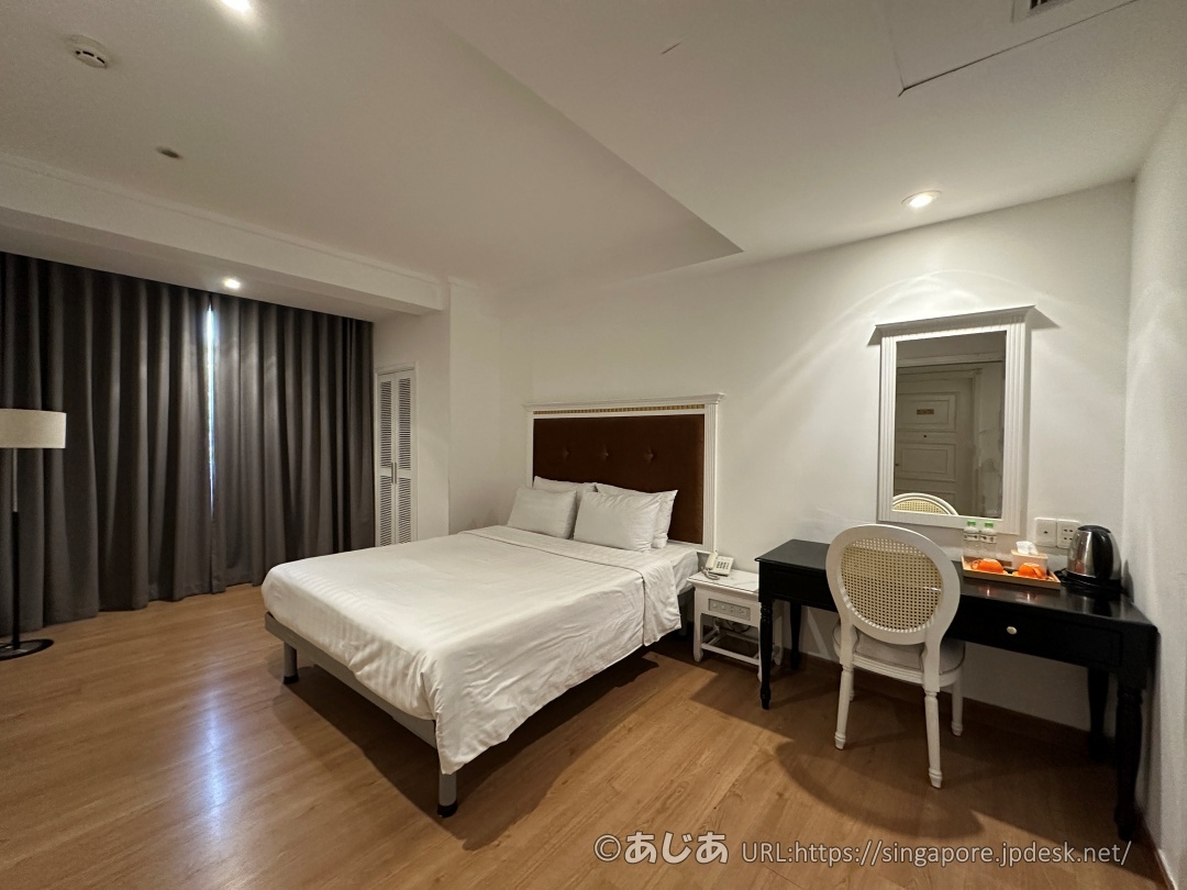 今回宿泊したのは、バスタブ付きの「デラックス ダブルルーム(Deluxe Double Room)」です。 広さは約28平米。ホーチミンの格安ホテルとしては十分な広さがあります。