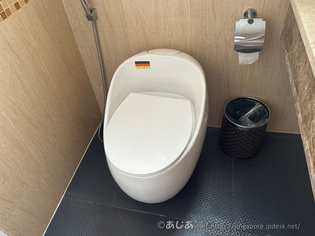 そしてトイレ。ドイツ国旗が貼られた謎の形状をしています。
