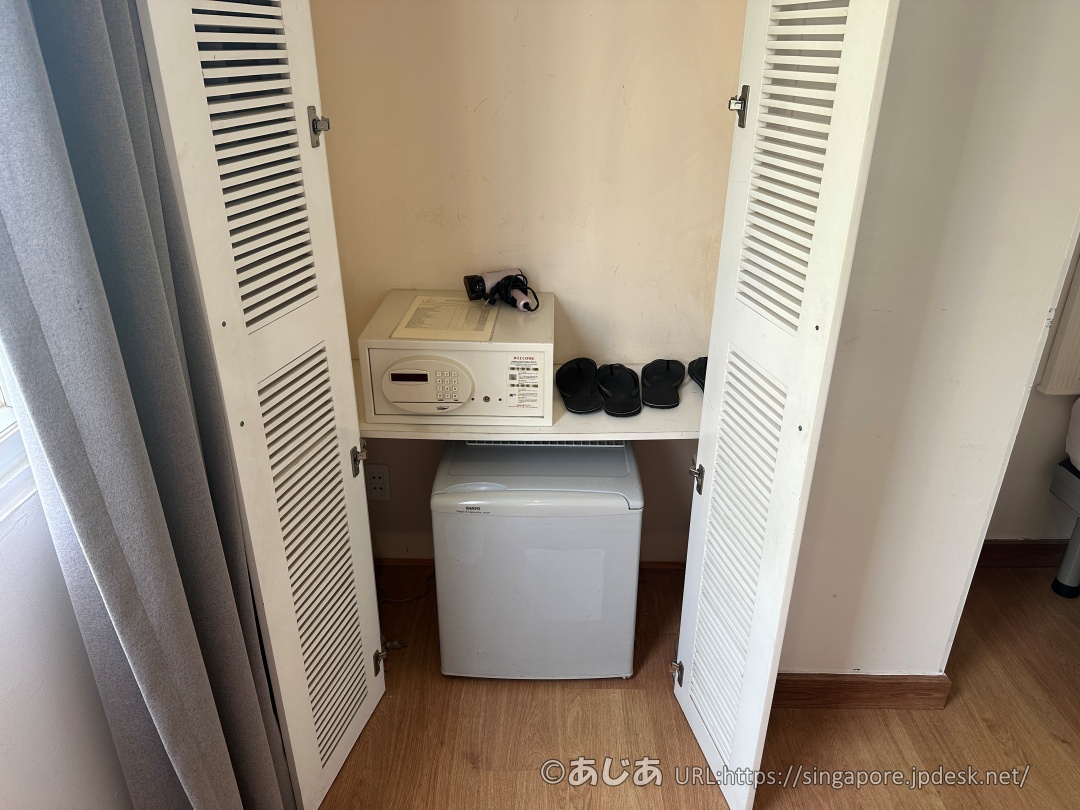 セキュリティーボックスあり。冷蔵庫もめっちゃ小さいのが置いてあります。