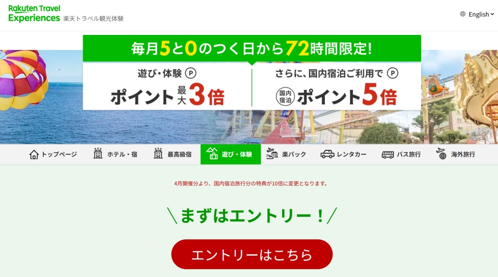 詳しくはこちら ≫5と0の日から3日間 楽天ポイントアップキャンペーン(楽天トラベル観光体験公式サイト)